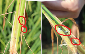 Nấm xanh bám dính và diệt rầy nâu trên mô hình canh tác úa ứng dụng chế phẩm nấm xanh (ảnh phải), hiệu quả rõ rệt so với thửa ruộng sử dụng thuốc diệt rầy 2 lần (ảnh trái)