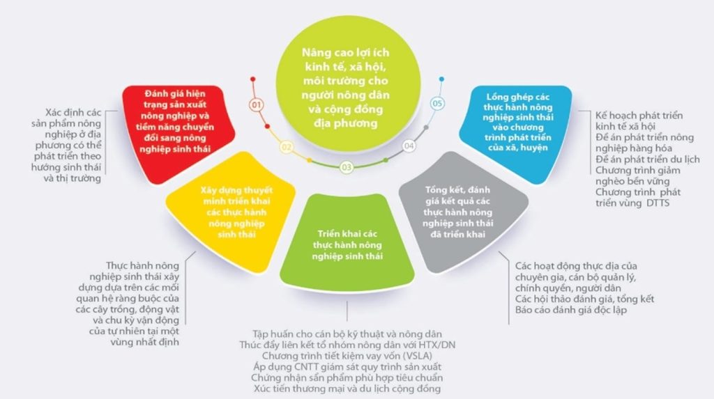 Hướng tiếp cận của dự án nhằm thúc đẩy các thực hành nông nghiệp sinh thái theo tiến trình như sơ đồ bên dưới: